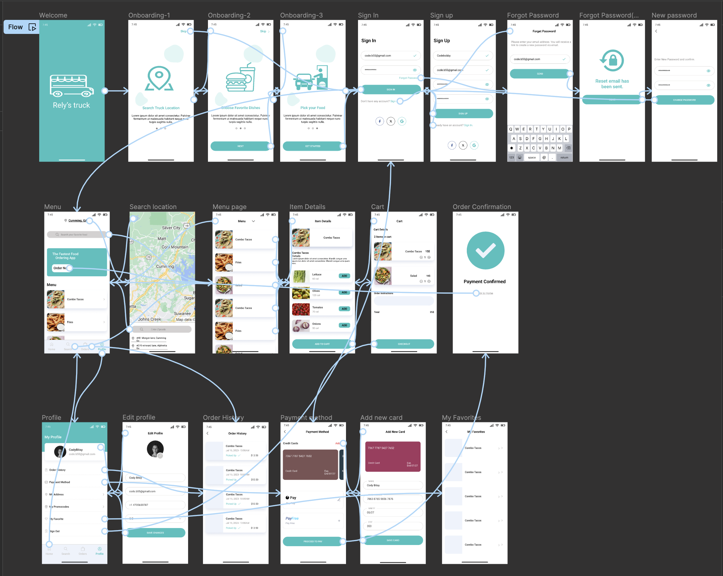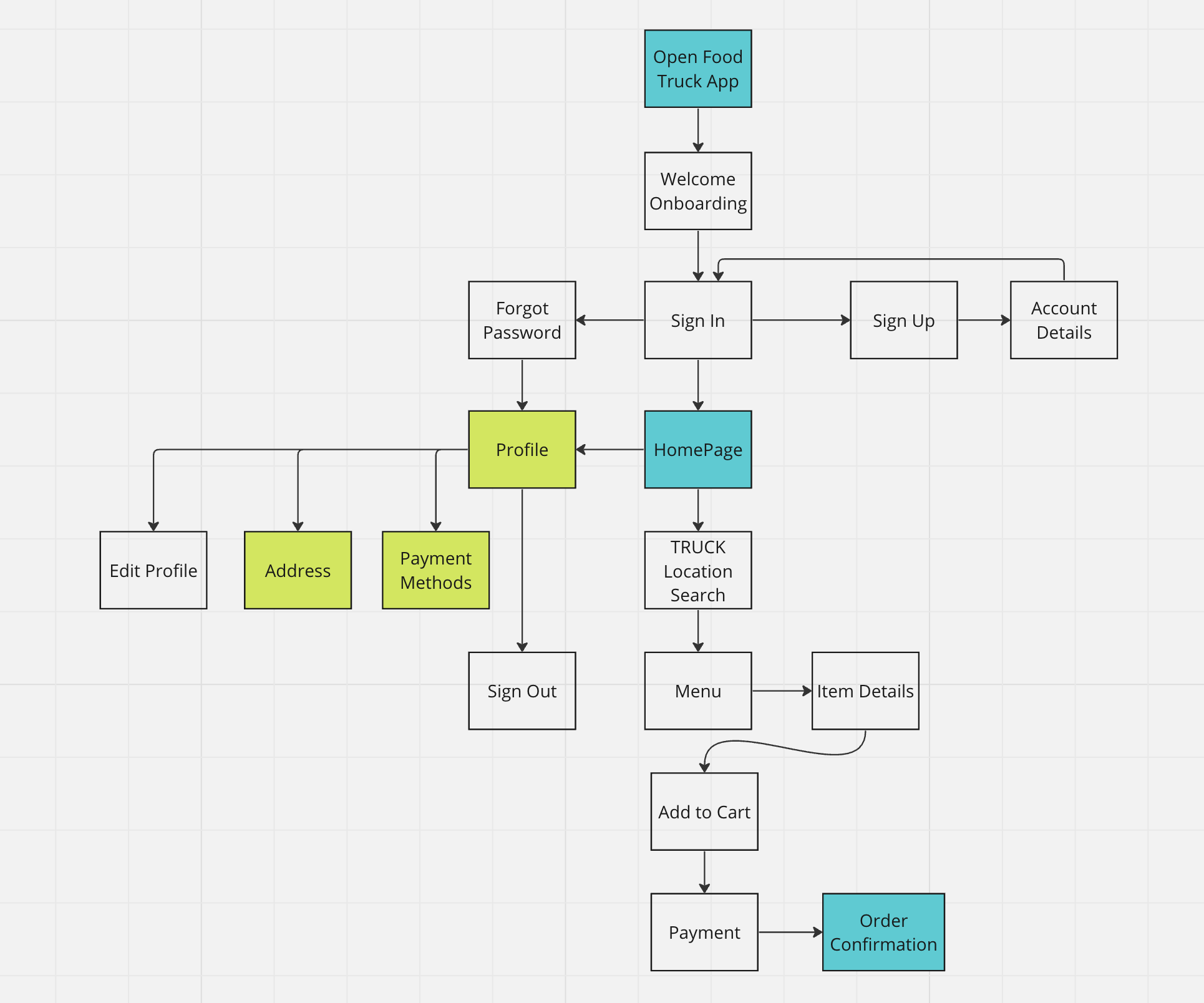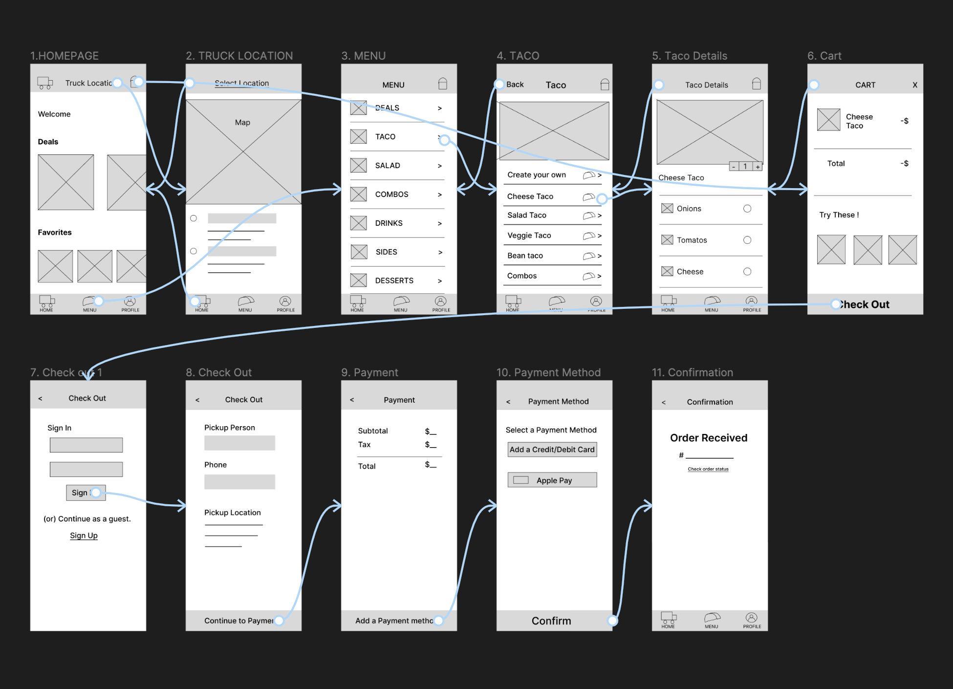 A user journey map was created to visually represent the steps taken by users from discovering the food truck to receiving their order. This tool helped identify key interaction points that needed design improvements.