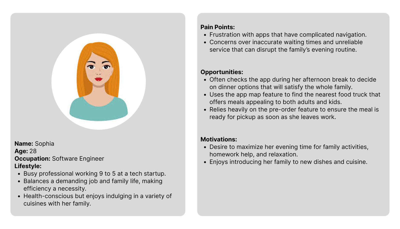 Based on the research, a user persona Sophia, was developed representing typical users of the taco food truck, goals, and user needs.