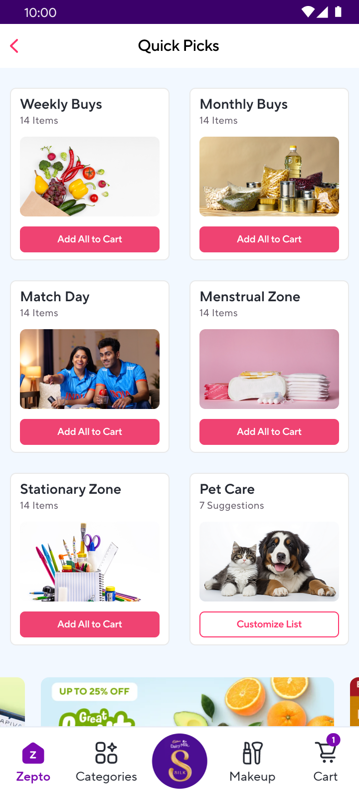 To enhance the Zepto app by introducing a user-friendly feature that allows customers to effortlessly add entire pre-made shopping lists to their cart with a single click. This feature aims to streamline the shopping experience by bundling frequently purchased items into themed lists, thereby reducing the time and effort required for users to manually search for and add individual items to their cart. By providing curated shopping lists that cater to common needs and occasions, we seek to improve user satisfaction, increase engagement, and drive higher conversion rates. This objective includes ensuring the new feature is seamlessly integrated into the existing app interface, maintains consistency with the overall design language, and delivers a smooth, intuitive user experience.