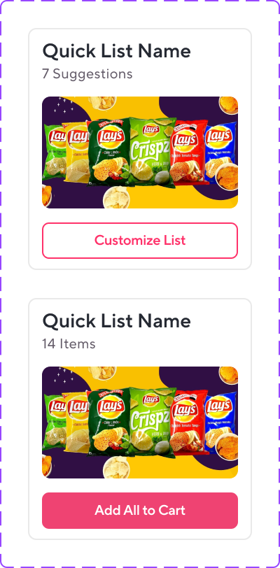 This feature allows users to quickly add a curated selection of items to their shopping cart without having to search for and add each item individually. Pre-made shopping lists are grouped by themes or frequent purchase patterns (e.g., “Baby Care Essentials,” “Morning Rush,” “Movie Night Munchies”). Each list is designed to meet specific needs or occasions, making the shopping experience more convenient and efficient for users.